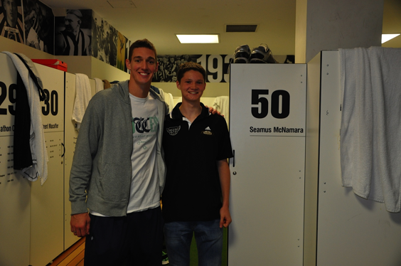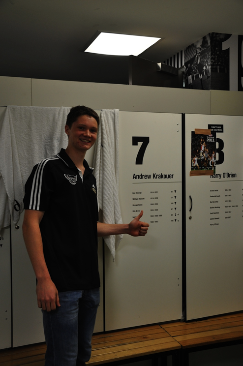 Tuesday afternoon Hannah and I went to the Westpac Center, the home of the Collingwood Magpies. We parked behind the Rod Laver Arena where the Australian Open is held. Rain lashed down on us, so we tried to find a shortcut through the parking lots out to the front of the arena. Luckily, we saw two men dressed in work clothes and asked them the quickest way out to the Westpac. They brought us underneath the arena and we saw a bunch of offices and some of the behind the scenes areas of the arena which was awesome and really lucky. Jonathon Bernard, the Digital Media Coordinator at the club greeted us and brought us inside. Then Shae McNamara, the club’s American recruit, brought us for a little tour of the facilities and explained what a normal week is like. He introduced me to Derek Hine, the head of recruiting. In his office were two players, Jarryd Blair and John McCarthy. I think they were a little surprised to find that I knew their names. Later Nathan Buckley walked by……. and not much more needs to be said about that. I also met Paul Licuria, former player and current team manager of the VFL side and got a picture. I have to give a shoutout to Jason, Domenic, and Wiggo in the video edits department because I told them where they could find my blog so hopefully they see this. Shae treated us to hot chocolate and we just chatted about footy, sports, Melbourne, Shae’s blog he plans to create, and a bunch of other things. It was something that will stick with me for life. I am really grateful to the Collingwood Football Club for having me and to Jonathon Bernard, Shae, Glenn Ormsby, and Hannah Oliver for the transport and picture taking.