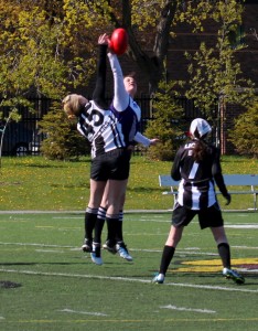 The Lady Pies traveled to Montreal, Canada for the first ever women’s tournament in the city with Boston, New York, andMontreal vying for the 2012 AFL Quebec Women’s Pre-season Cup. Lady Magpie veterans led the team of mostly first-time players against a more experienced Boston Lady Demons team in the first match of the weekend. While the new Lady Pies’ gained their footing, Boston came out for a quick lead that continued on until the final whistle.