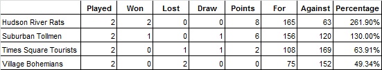 With the Recfooty game postponed for the week, the Hudson River Rats and Village Bohemian game got underway with both teams supplemented by talent from the Trash and the Tourists. The River Rats superior level of talent showed early however with ruckman Scott McMaster giving good service to his midfielders Buxton, Felsenthal, Murphy and Nick Brooks who delivered well to their forwards. Primary Rats target Andy Bowen presented and kicked well to put his team up by a few goals early in the game. The Boho’s showed their fighting spirit however with Eddy Buckingham, Brad Davis, Matt Barlaz and Dylan Martin getting plenty of the ball and it was only the efforts of Rats full-back, Glenn Ormsby to touch a couple of kicks on the line that prevented Boho from being right in the contest. The Rats continued to move the ball well for the rest of the half and led 7.1 43 to 1.3 9 at half time.