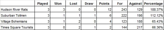 The River Rats knew that they could confirm their spot in the 2012 NYCAFL grand final and continue their unbeaten run with a win other the 2nd placed team on the ladder, the Suburban Tollmen. The game started exactly as they hoped with Rats captain Jeremy Spiteri collecting the ball from the opening tap by Adam Mantzaris and goaling with mere seconds on the clock. Not to be out done the Trash roved the next contest and kicked truly to make it 1 goal a piece with less than a minute played. The next possession continued the trend as the Rats got the ball down quickly to their full forward, Andy Bowen who converted to put the Rats up again. Unfortunately for the Trash, they couldn’t answer straight back and the Rats managed to be more productive during the half with Rob Donner, Brett Felsenthal and Brendan Murphy particularly busy. At half time the Rats led the Trash 10.0 60 to 5.0 30.