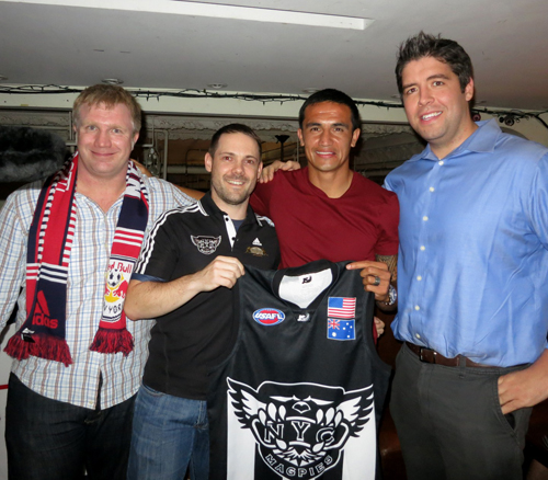 To celebrate the Socceroos qualifying for the FIFA 2014 World Cup, great sponsor of the NYC Magpies, The Australian NYC, held a VIP event in conjunction with the New York Red Bulls and Tim Cahill. This even served as a thank you for the continued support for Tim from Australian fans both at home and here in the US. Members of the NYC Magpies and The Australian NYC owner Matt Astill were on hand to present Tim with a Magpies jumper in recognition of the New York Australian footballing community.